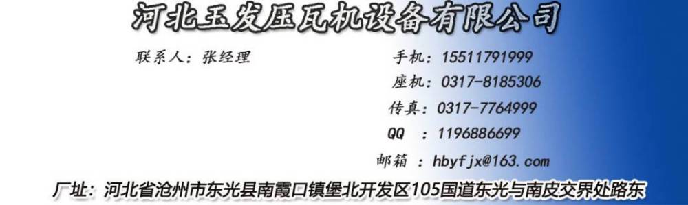公司名稱:河北玉發壓瓦機設備有限公司 公司地址:河北省滄州市東光縣南霞口鎮堡北開發區105國道東光與南皮交界處路東 電話:15511791999 0317-8185306 傳真:0317-7764999 手機:15511791999 網址: